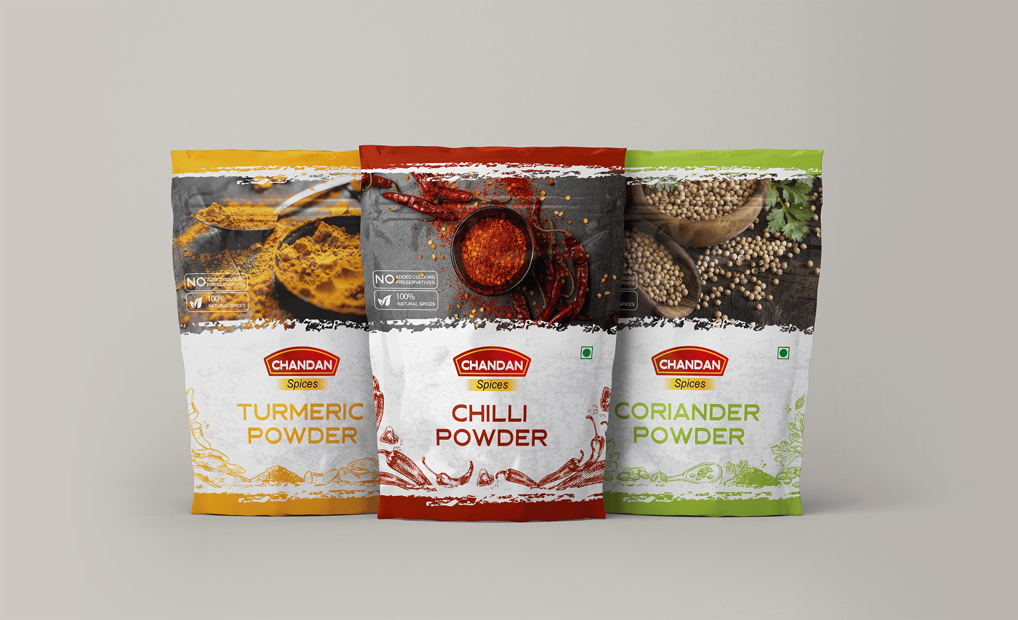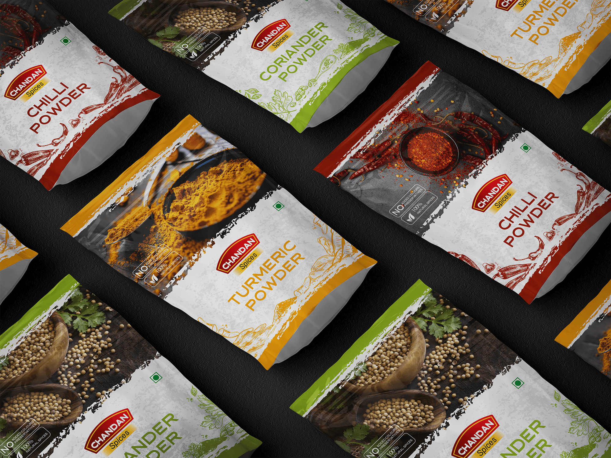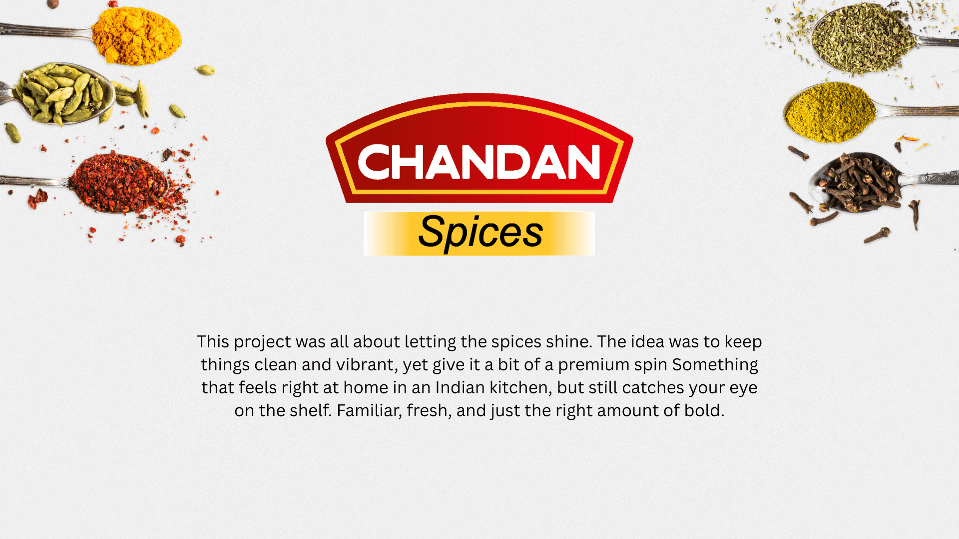 A packaging design project for Chandan Spices, aimed at giving their core range a clean, vibrant, and premium look. The goal was to highlight the richness of the product while balancing tradition with a modern, shelf-friendly aesthetic.