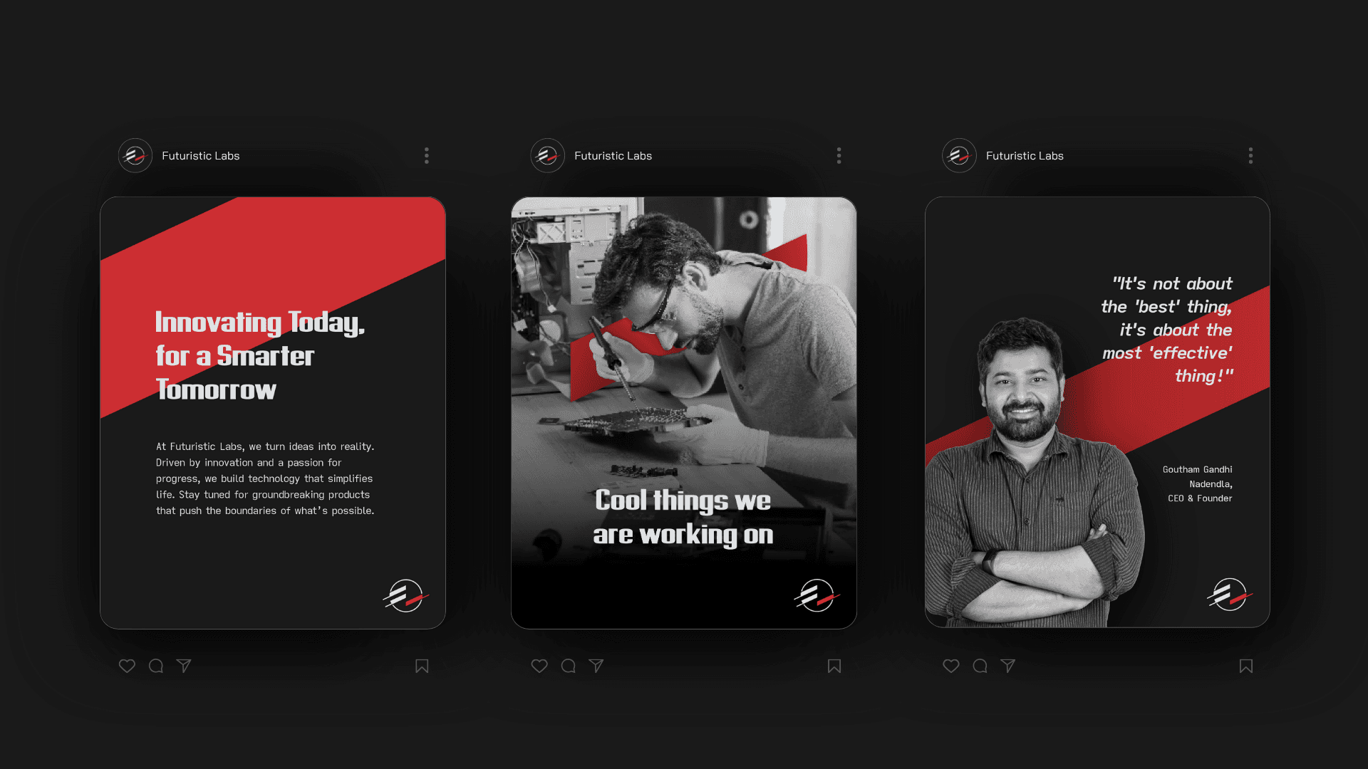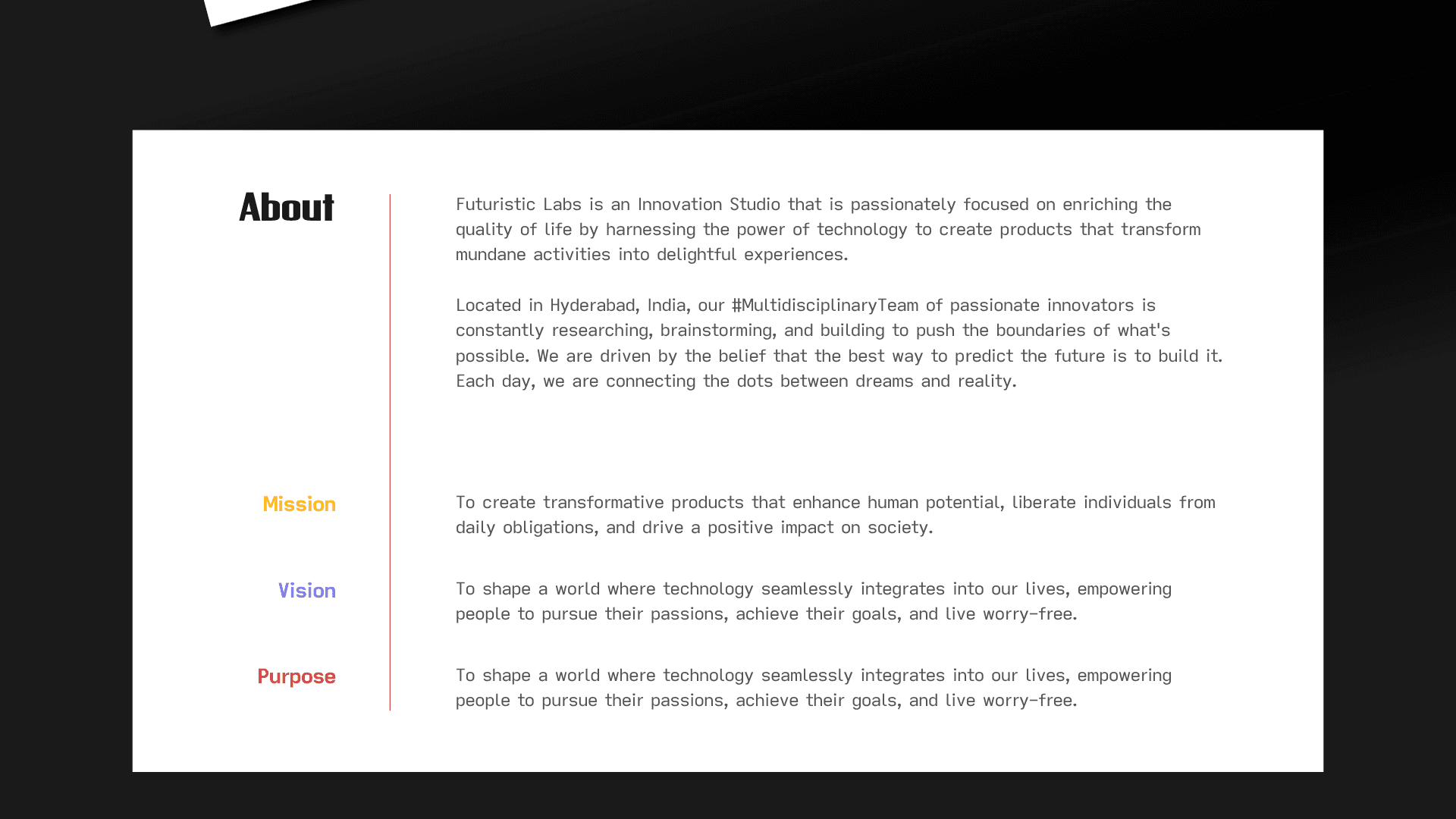 As a young and growing company, Futuristic Labs needed a cohesive visual identity that could articulate its vision and values. The brand required a modern and scalable system that would feel futuristic, intuitive, and adaptable across various touchpoints, from product presentations to internal communications.