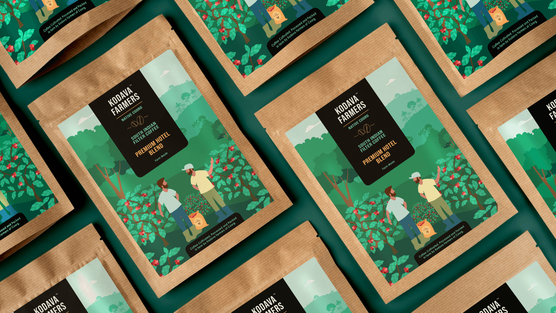 A rich, illustration-led design that visually narrates the story of the land, the farmers, and the process behind each brew. The kraft base gives it an earthy, grounded feel, while the detailed visuals and structured label system add clarity, charm, and brand presence across formats.