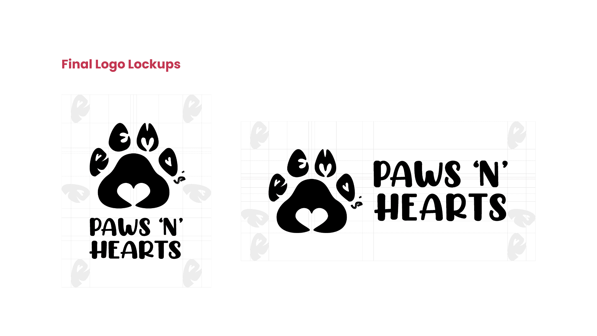Explored playful logo concepts that blend heart and paw symbolism
