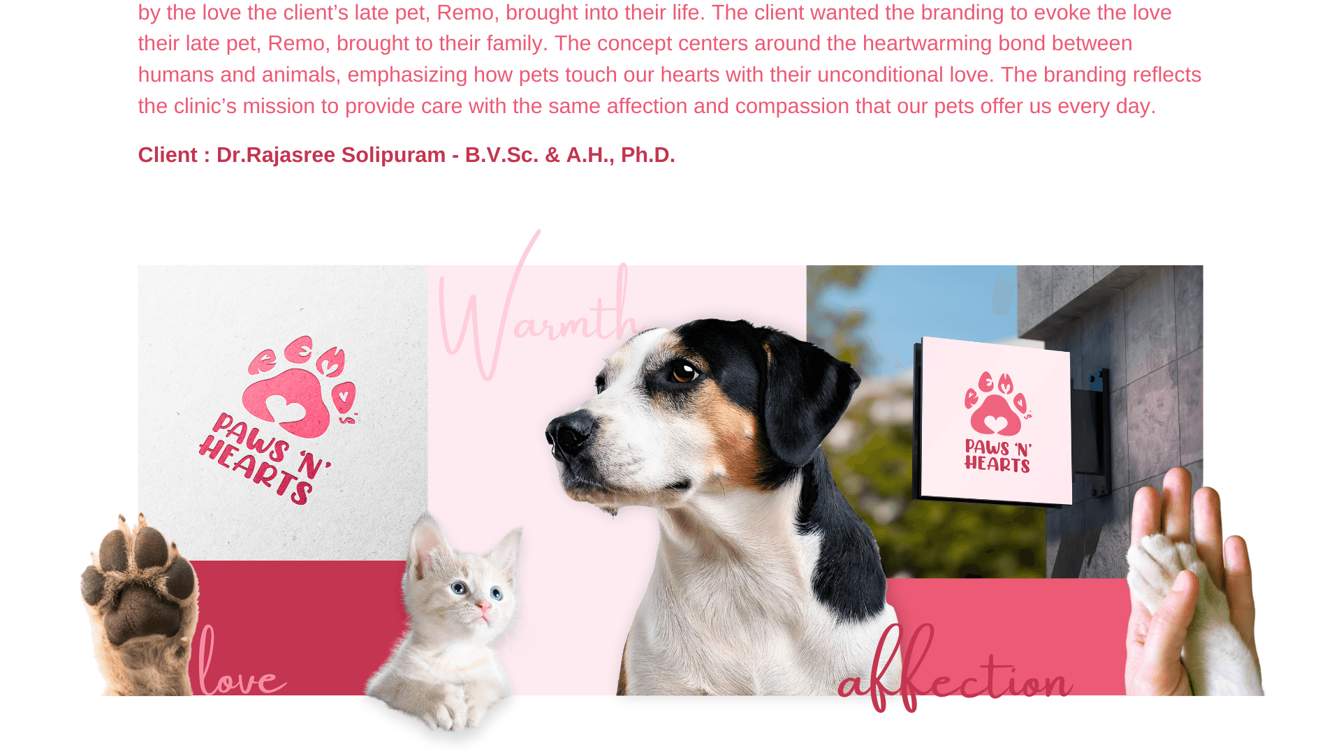 The branding leans into soft curves, friendly forms, and a bright, loving color palette. The logo combines a paw and heart in a way that feels both expressive and instantly recognizable. Every element from type choices to layouts, was designed to radiate playfulness and care, creating a system that feels as friendly as a tail wag.